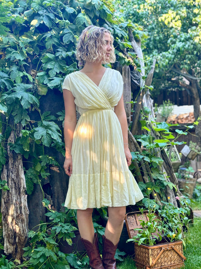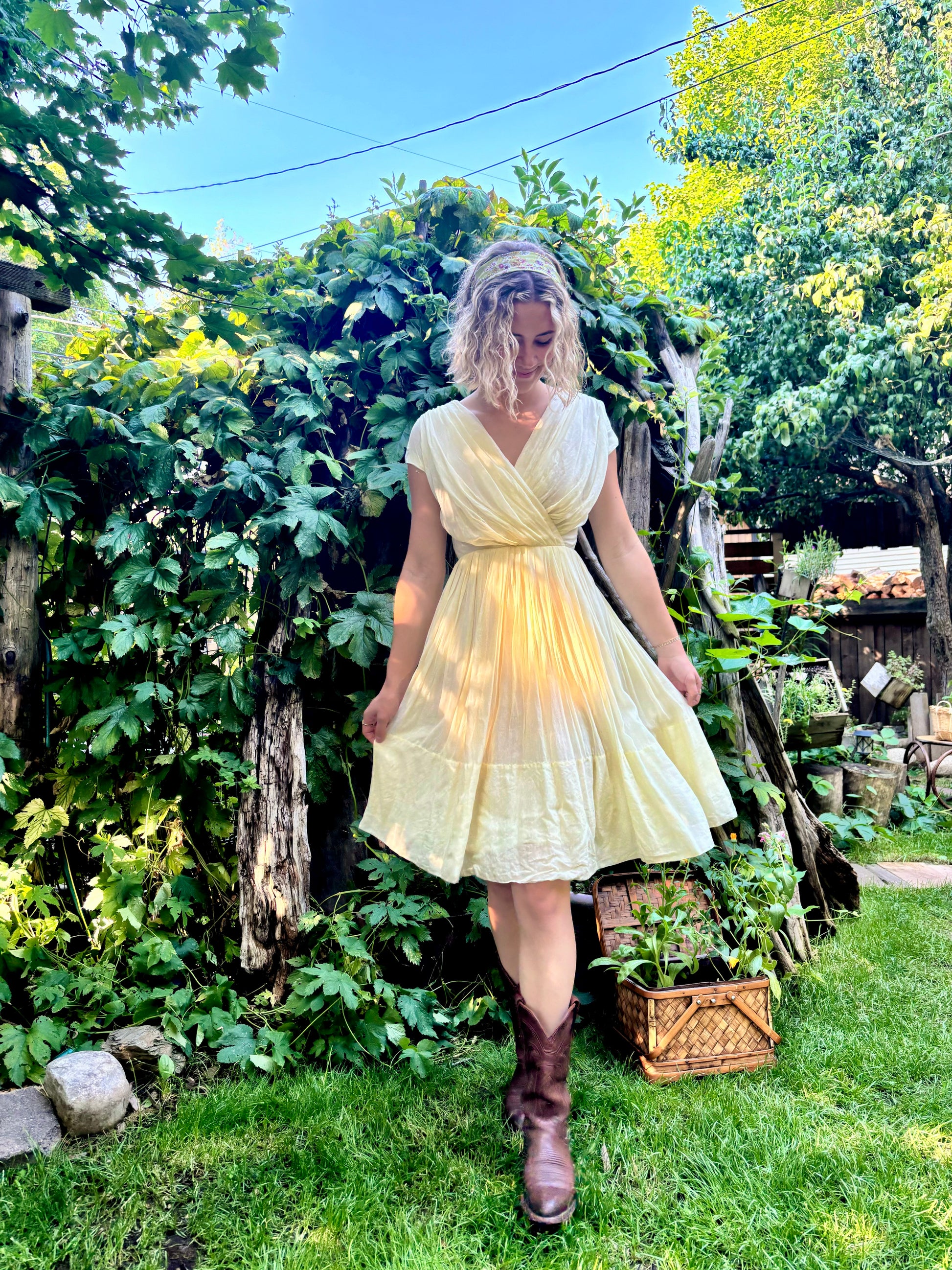 Details: Beautiful pleated & ‘gauzy’ ivory dress. So flattering! V back with zipper in tact, no flaws. Great condition!